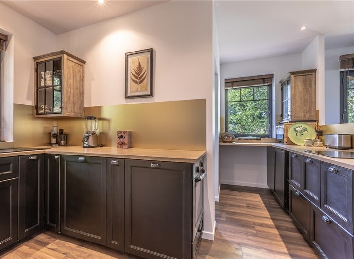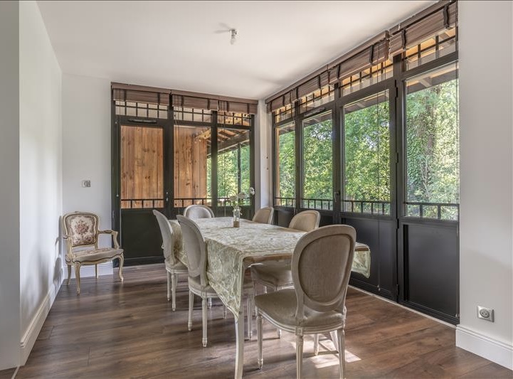 Espace de vie : Une salle à manger offrant une vue panoramique sur des chênes centenaires, un salon cosy et une cuisine entièrement aménagée et équipée.